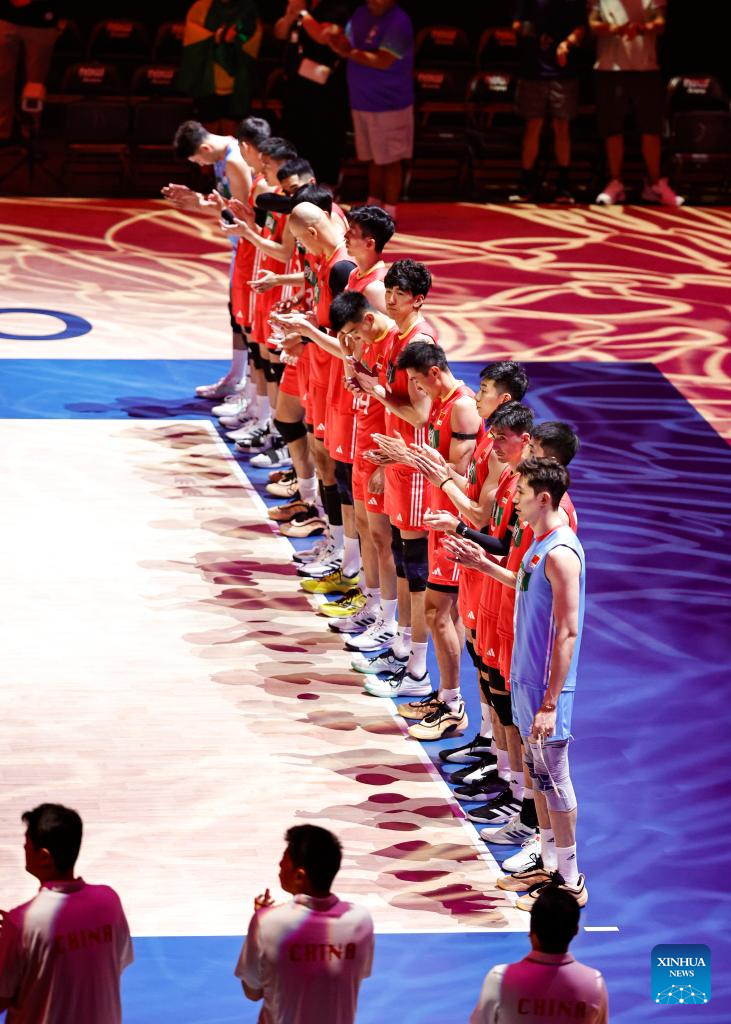 Players of China stand in line for the national anthem before the Pool 5 match between China and Brazil at the Men's Volleyball Nations League (VNL) 2025 in Chicago, the United States, June 26, 2025. (Photo by Joel Lerner/Xinhua)
