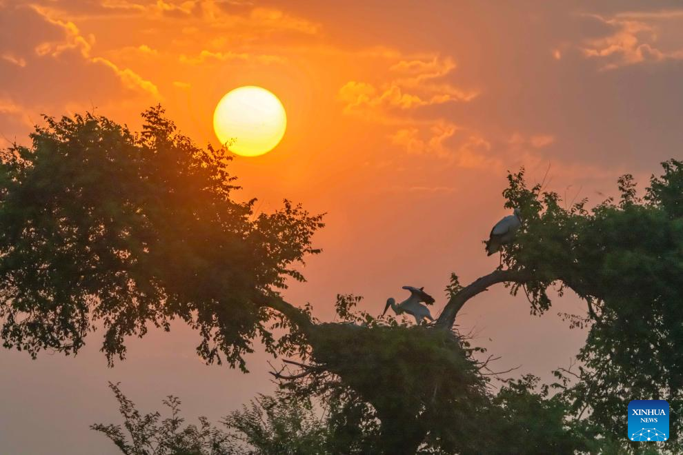 A drone photo taken on June 24, 2025 shows oriental white stork chicks resting in the nest at the Bachadao National Nature Reserve in Tongjiang, northeast China's Heilongjiang Province. As summer progresses, the breeding season of oriental white storks is gradually coming to an end. The growing chicks begin to learn how to fly under the guidance of their parents.