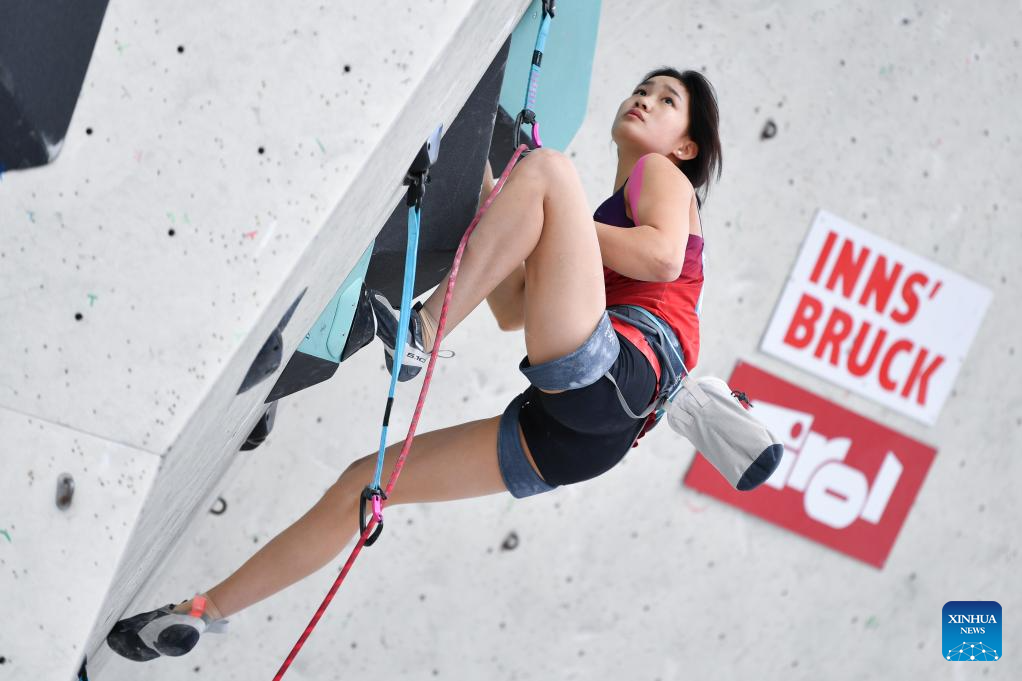 Luo Zhilu of China competes during the women's lead qualification at the International Federation of Sport Climbing (IFSC) World Cup in Innsbruck, Austria, June 28, 2025. (Xinhua/Lian Yi)
