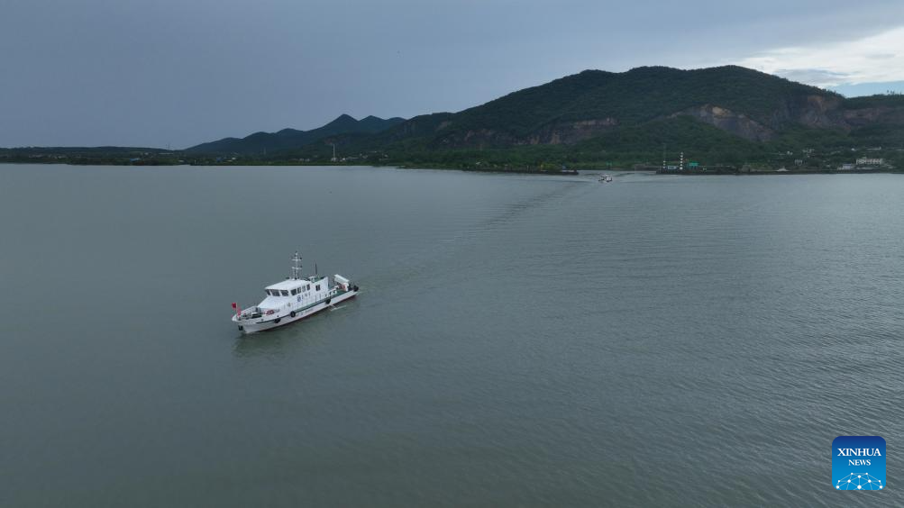 This photo taken on June 28, 2025 shows the pure ammonia-powered demonstration vessel, the "Anhui," making its maiden voyage at the water area of Chaohu Lake in Hefei, east China's Anhui Province. (Xinhua/Zhou Mu)