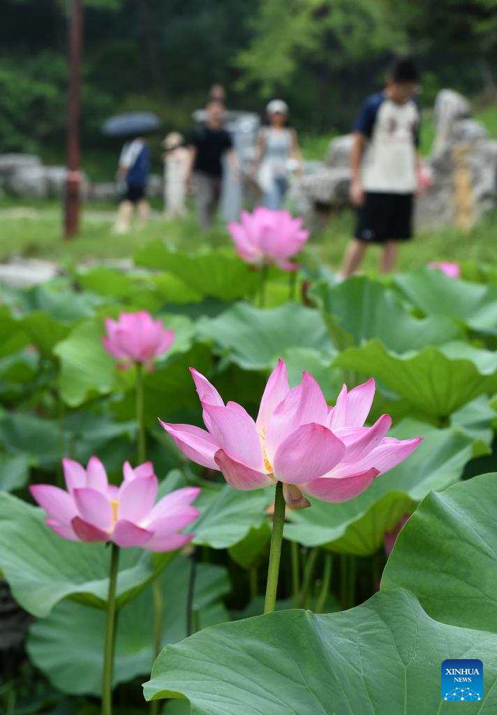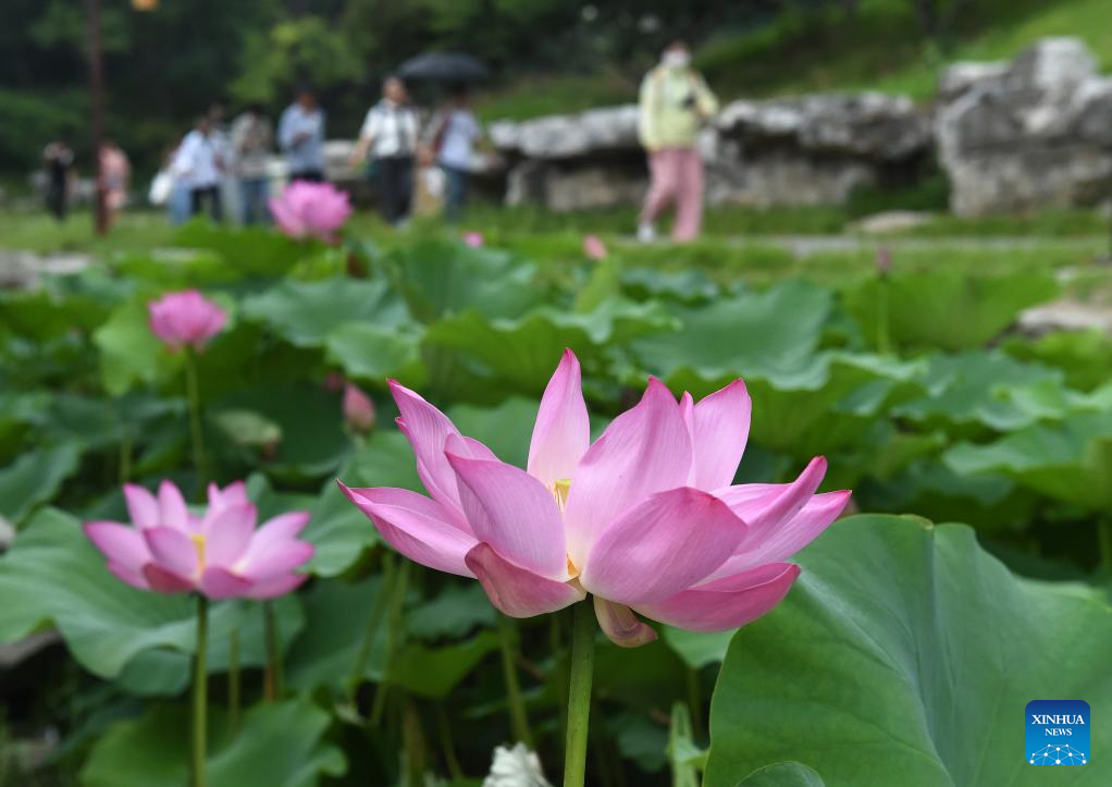 Tourists enjoy lotus flowers during a lotus festival at Yuanmingyuan Park in Beijing, capital of China, June 28, 2025. A lotus festival kicked off in Yuanmingyuan Park on Saturday and will run until Aug. 31. (Xinhua/Luo Xiaoguang)