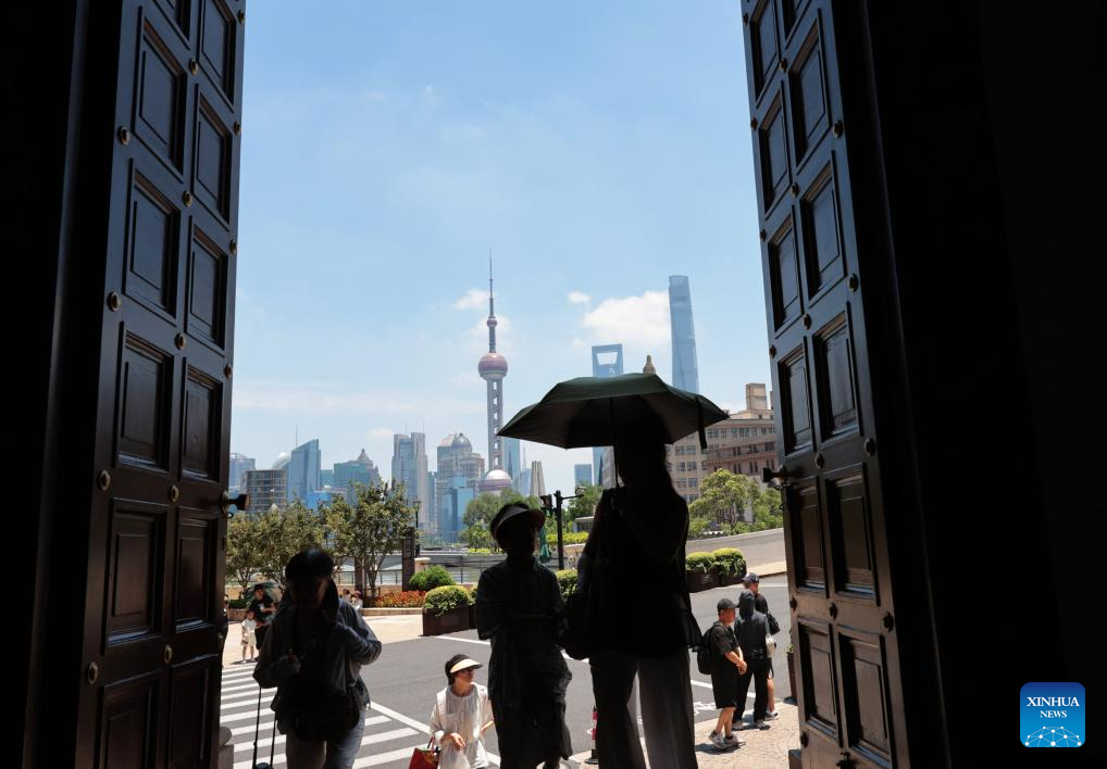 Tourists visit the Bund area in Shanghai, east China, June 29, 2025. Shanghai issued a heatwave alert on Sunday, which will last for about 10 days with high temperature hitting 39-40 degrees Celsius. (Xinhua/Fang Zhe)