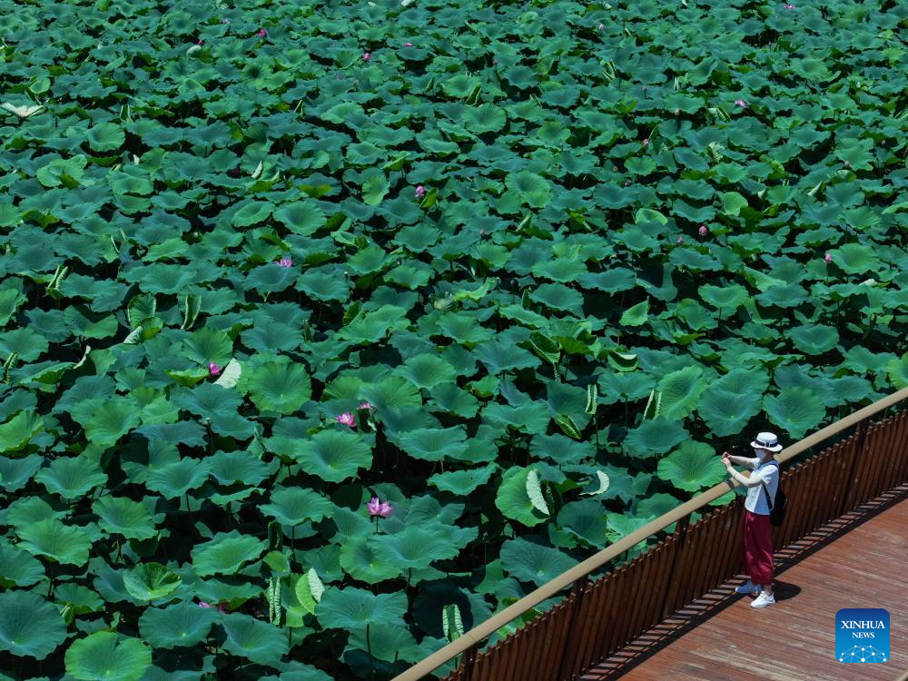 A drone photo taken on July 1, 2025 shows a tourist taking photos of lotus flowers on a plank road at the Xuanwu Lake Park in Nanjing, east China's Jiangsu Province. (Xinhua/Li Bo)
