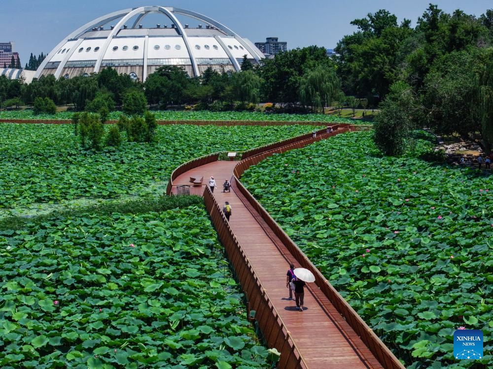 An aerial drone photo taken on July 1, 2025 shows people walking on a plank road to enjoy lotus flowers at the Xuanwu Lake Park in Nanjing, east China's Jiangsu Province. (Xinhua/Li Bo)