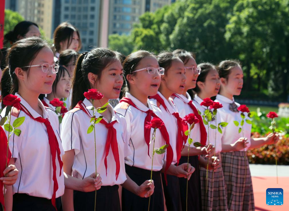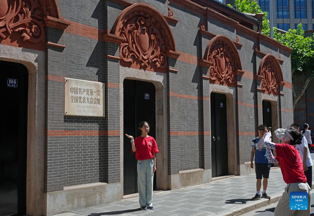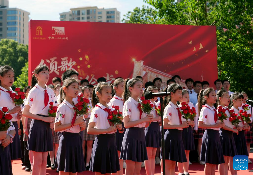 Students chorus in front of the memorial of the First National Congress of the Communist Party of China in Shanghai, east China, July 1, 2025. A series of events celebrating the 104th founding anniversary of the Communist Party of China (CPC) were held at the memorial of the First National Congress of the CPC on Tuesday. (Xinhua/Liu Ying)