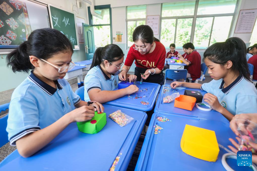 Students from the East China Normal University teach children to make paper hats at the Donghe Township central school in Donghe Township, Zhuji City of east China's Zhejiang Province, July 1, 2025. Summer camps themed on cultural promotion have been launched here, to enrich summer vocation activities for local students. (Xinhua/Xu Yu)