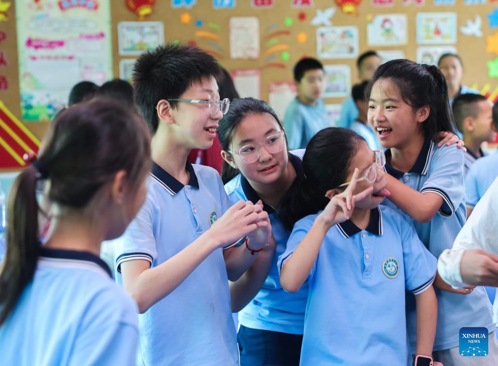 Children play an interactive game at the Donghe Township central school in Donghe Township, Zhuji City of east China's Zhejiang Province, July 1, 2025. Summer camps themed on cultural promotion have been launched here, to enrich summer vocation activities for local students. (Xinhua/Xu Yu)