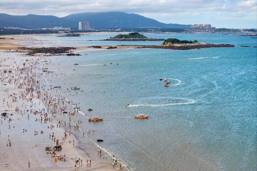 With a sea area of 6,064 square kilometers, 408 kilometers of coastline, around 70 kilometers of sandy beaches, and 126 islands, Pingtan in Fujian province boasts abundant marine tourism resources.