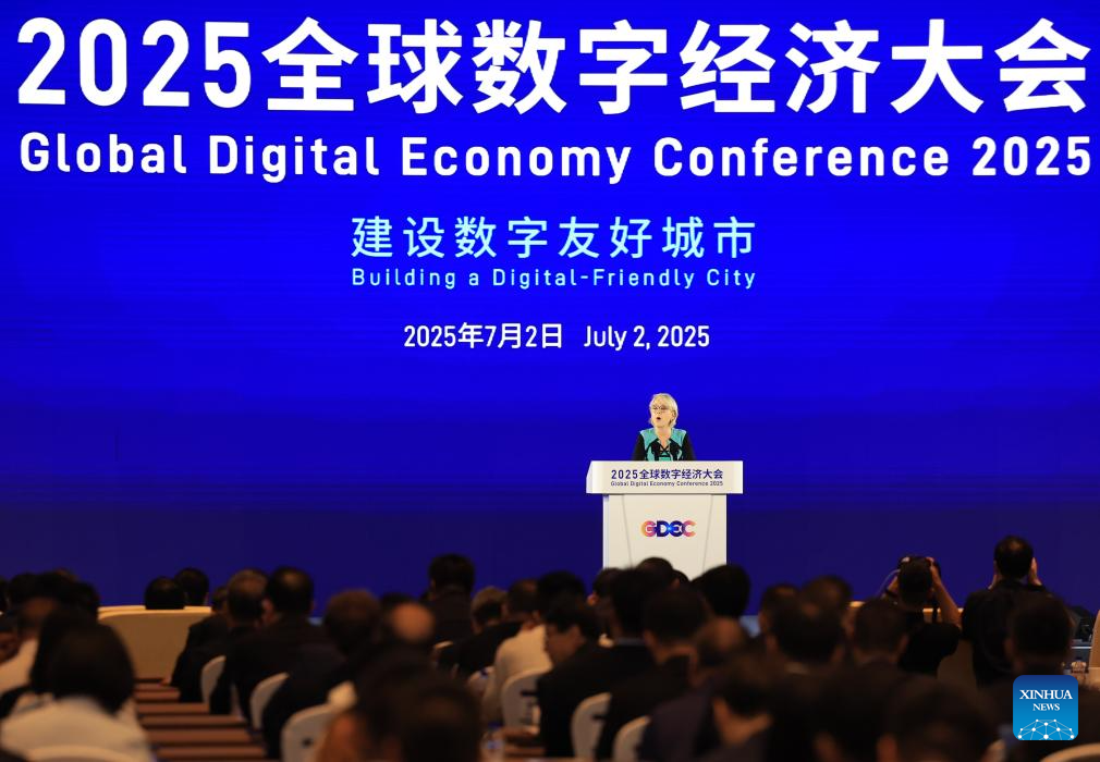 Beate Trankmann, the United Nations Development Programme (UNDP) resident representative for China, speaks during the opening ceremony of the 2025 Global Digital Economy Conference in Beijing, capital of China, July 2, 2025. With the theme "Building a Digital-Friendly City", the 2025 Global Digital Economy Conference opened here on Wednesday. (Xinhua/Zhang Chenlin)