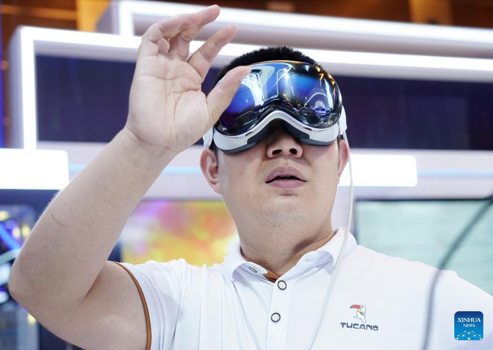 A visitor tries an MR device at an exhibition area of the 2025 Global Digital Economy Conference in Beijing, capital of China, July 2, 2025. With the theme "Building a Digital-Friendly City", the 2025 Global Digital Economy Conference opened here on Wednesday. (Xinhua/Zhang Chenlin)
