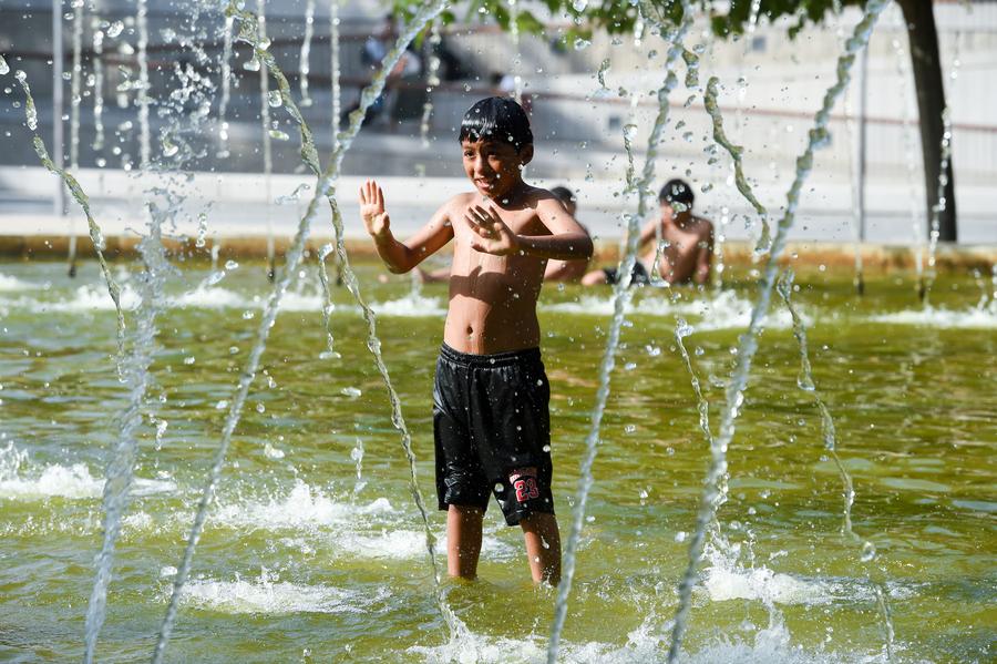 A boy cools off at a fountain in a park in Madrid, Spain, June 29, 2025. Spain has been hit by a new round of heatwave since Saturday, with temperatures in many regions expected to exceed 40 degrees Celsius in the coming days. (Photo by Gustavo Valiente/Xinhua)