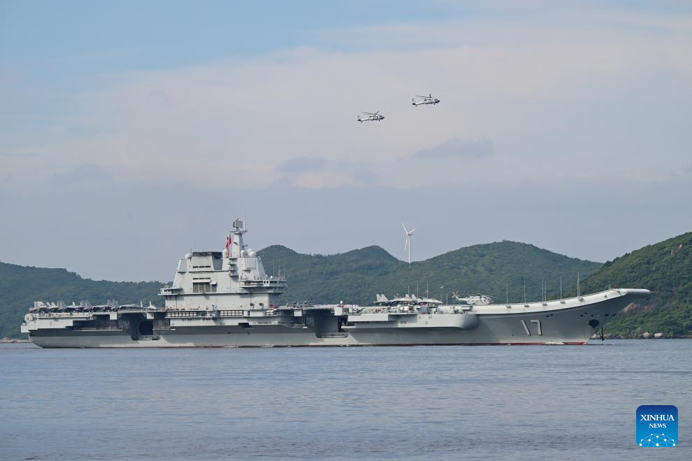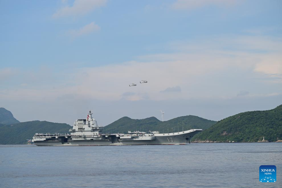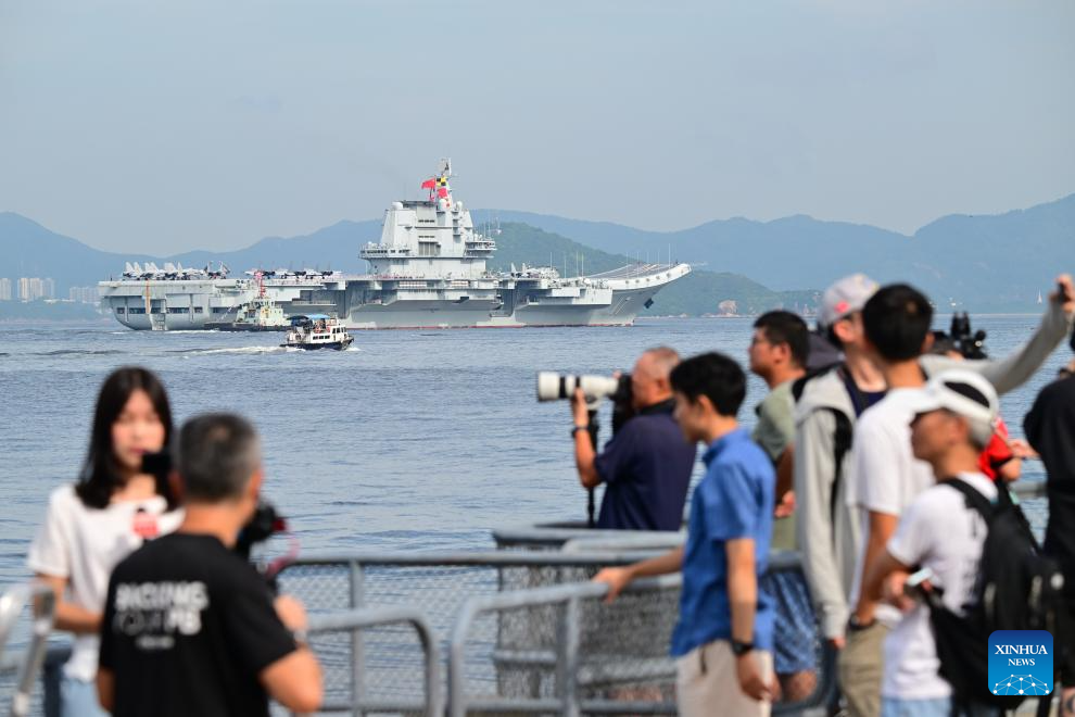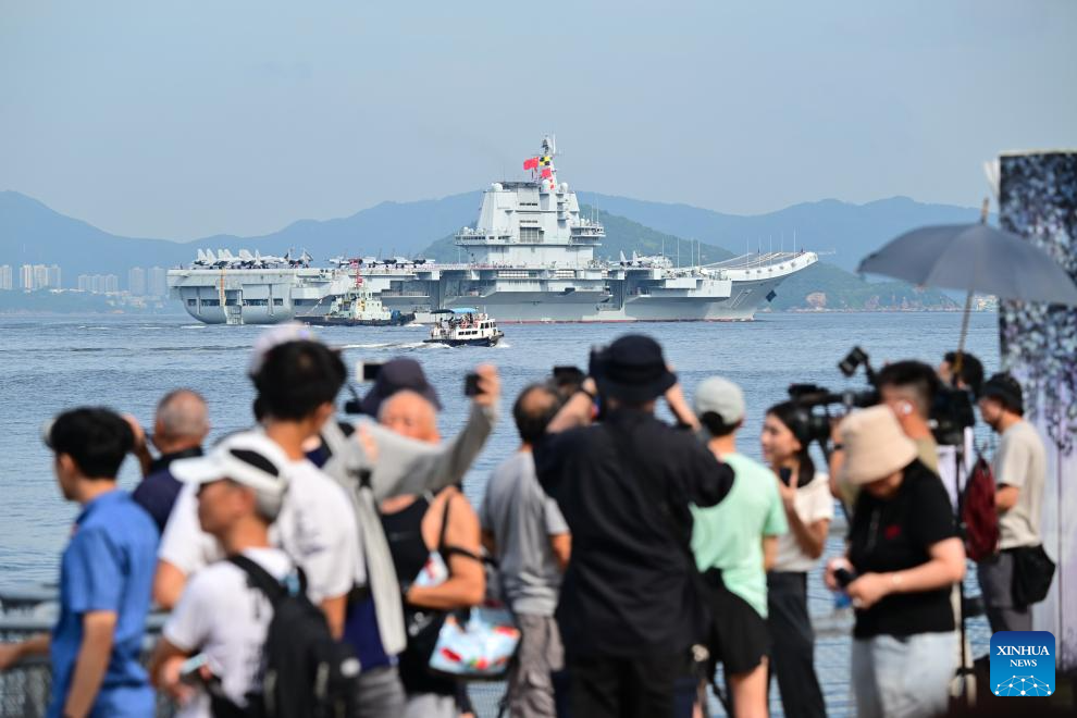 This photo shows the aircraft carrier Shandong sailing in Hong Kong waters, south China, July 3, 2025. A fleet of the Chinese People's Liberation Army Navy led by the aircraft carrier Shandong arrived in the Hong Kong Special Administrative Region on Thursday morning. (Xinhua/Zhu Wei)