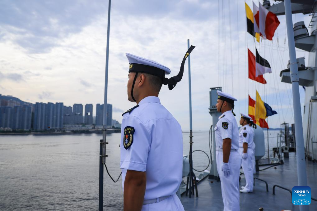 Soldiers line up on the deck of Zhanjiang missile destroyer during its visit to Hong Kong, south China, on July 3, 2025. A fleet of the Chinese People's Liberation Army Navy led by the aircraft carrier Shandong arrived here on Thursday morning. (Photo by Li Tang/Xinhua)