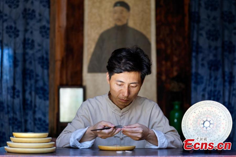 Wu Zhaoguang, an inheritor of hand-made Wan'an compass, makes a compass in Xiuning County of Huangshan City, east China's Anhui Province, July 2, 2025. (Photo: China News Service/Shi Yalei)