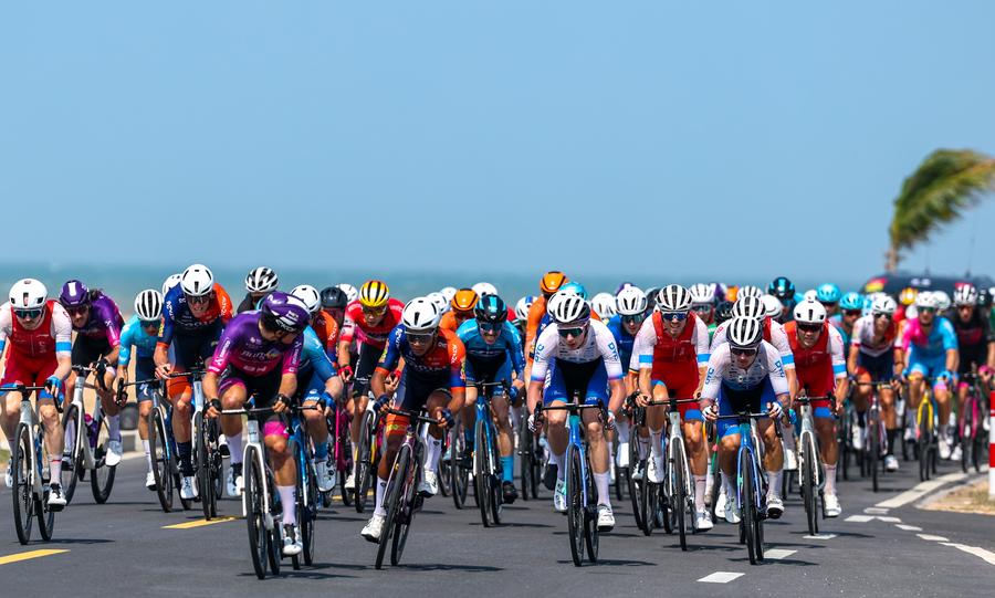 Cyclists compete during Stage 5 at the 16th Tour of Hainan cycling race from Dongfang to Sanya, south China's Hainan Province, April 11, 2025. (Xinhua/Yang Guanyu)