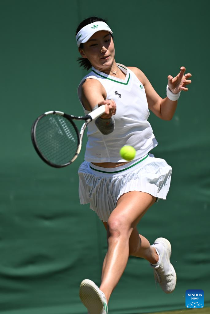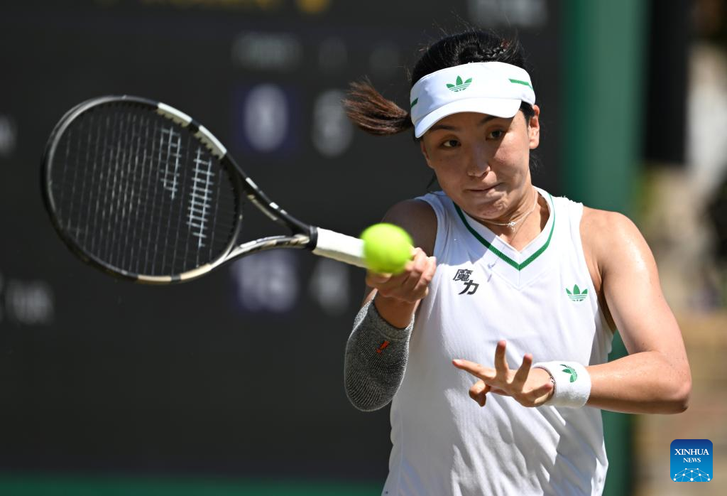 Wang Xinyu hits a return during the women's singles second round match between Wang Xinyu of China and Zeynep Sonmez of Türkiye at the Wimbledon Tennis Championships in London, Britain, July 3, 2025. (Xinhua/Zhao Dingzhe)