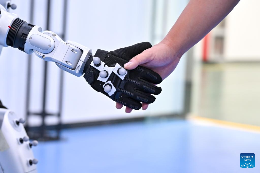 A humanoid robot shakes hands with a staff member at Anhui Efort Intelligent Equipment Co., Ltd. in Wuhu, east China's Anhui Province, July 3, 2025. (Xinhua/Zhang Cheng)