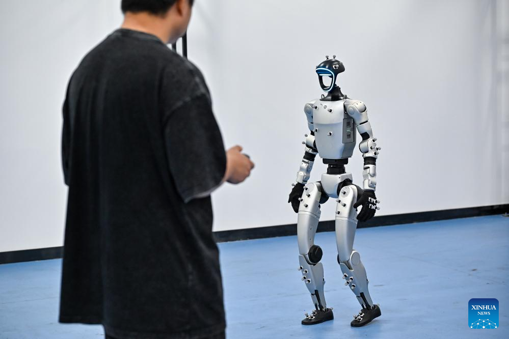 A staff member debugs a humanoid robot at Anhui Efort Intelligent Equipment Co., Ltd. in Wuhu, east China's Anhui Province, July 3, 2025. (Xinhua/Zhang Cheng)