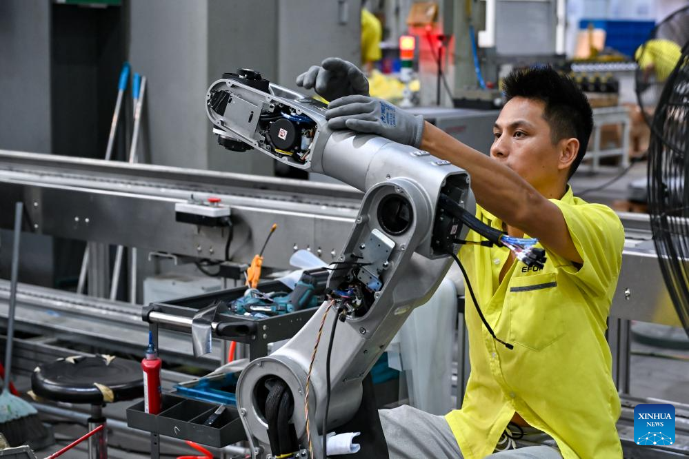 A staff member assembles a robot at Anhui Efort Intelligent Equipment Co., Ltd. in Wuhu, east China's Anhui Province, July 3, 2025. (Xinhua/Zhang Cheng)