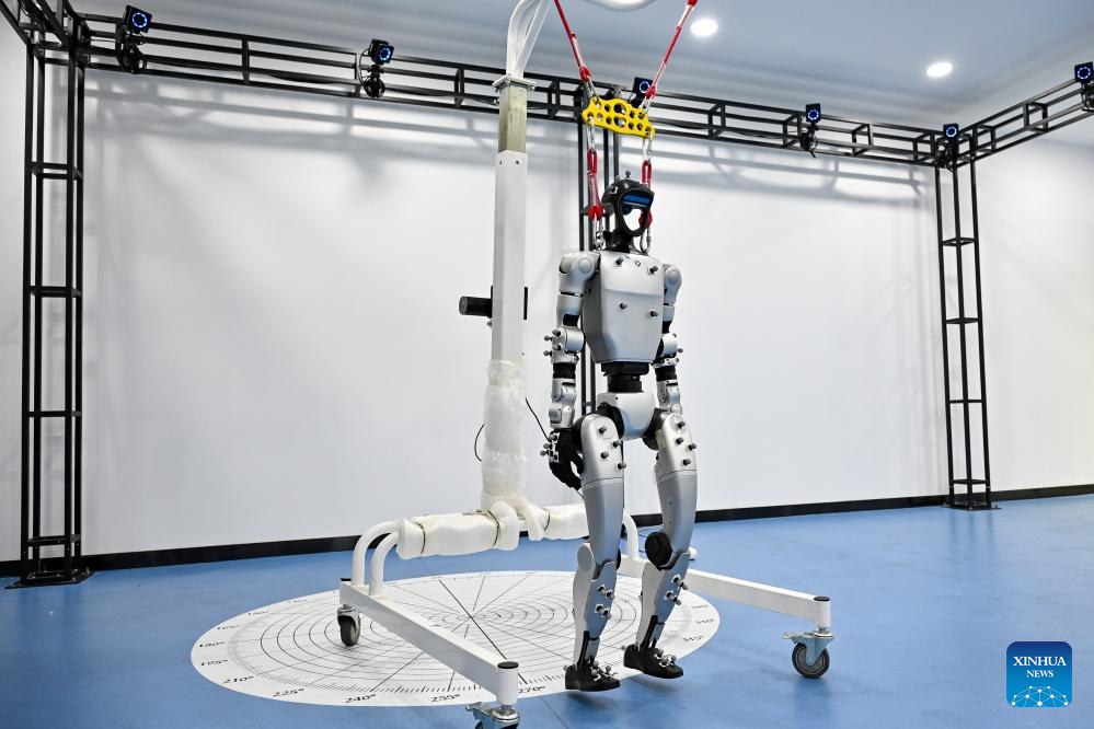 A humanoid robot trains with the assistance of motion capture equipment at Anhui Efort Intelligent Equipment Co., Ltd. in Wuhu, east China's Anhui Province, July 3, 2025. (Xinhua/Zhang Cheng)