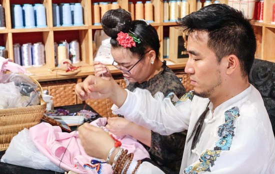 Yang Chunlin (R) makes embroidery at his studio in Kaili, southwest China's Guizhou Province, May 14, 2025. (Xinhua/Zhou Xuanni)