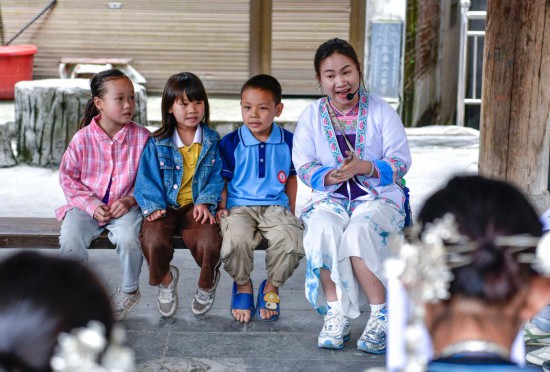 Yang Xiangni (1st R) teaches children to sing songs of the Dong ethnic group in Zhaoxing Town of Liping County, southwest China's Guizhou Province, April 22, 2025. (Xinhua/Yang Wenbin)