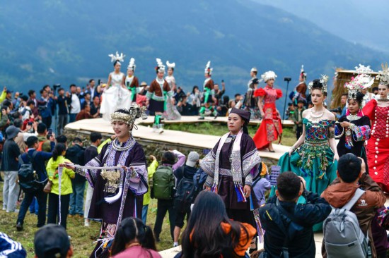 People participate in the "Village T," an ethnic costume show, in Taijiang County, southwest China's Guizhou Province, April 13, 2025. (Xinhua/Yang Wenbin)