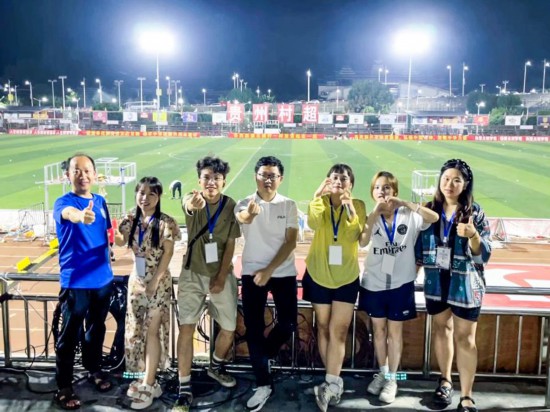Wang Yongjie (4th L) poses for photos with members of his new media team after finishing their work on the football field for the "Village Super League," or "Cun Chao," in Rongjiang County, southwest China's Guizhou Province on July 29, 2023. (Xinhua)