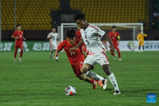 Takeuchi Yuzo (R) of Japan vies with Kuang Zhaolei (C) of China during the CFA Team China Shenyang Peace Cup International Tournament 2025 football match between the U16 men's teams of China and Japan in Shenyang, northeast China's Liaoning Province, July 4, 2025. (Xinhua/Pan Yulong)