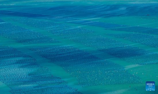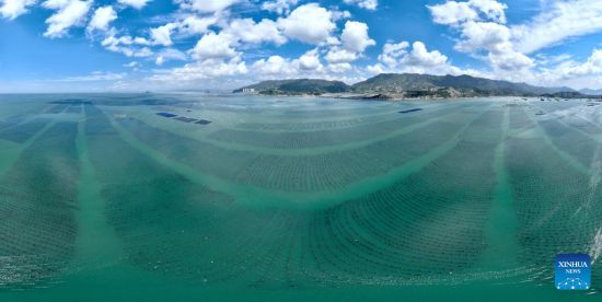 An aerial drone photo taken on July 3, 2025 shows a panoramic view of a national-level marine ranch in Lianjiang County of Fuzhou, southeast China's Fujian Province. Leveraging its unique marine resources, distinctive fisheries industry, and regional economic advantages, Lianjiang County has in recent years been promoting the upgrade and intelligent transformation of deep-sea and far-sea mariculture platforms, and developing the farming of aquatic products such as kelp, large yellow croaker, and abalone.