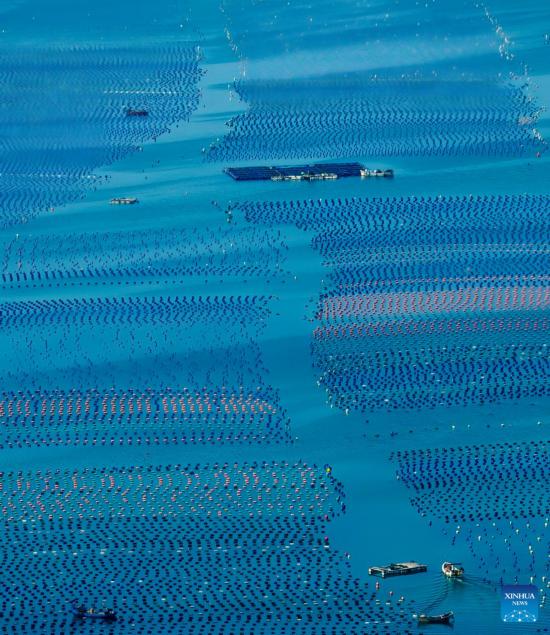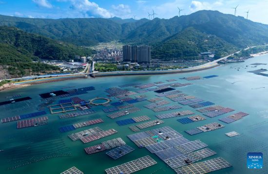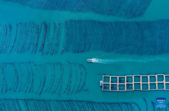 An aerial drone photo taken on July 3, 2025 shows a national-level marine ranch in Lianjiang County of Fuzhou, southeast China's Fujian Province. Leveraging its unique marine resources, distinctive fisheries industry, and regional economic advantages, Lianjiang County has in recent years been promoting the upgrade and intelligent transformation of deep-sea and far-sea mariculture platforms, and developing the farming of aquatic products such as kelp, large yellow croaker, and abalone.