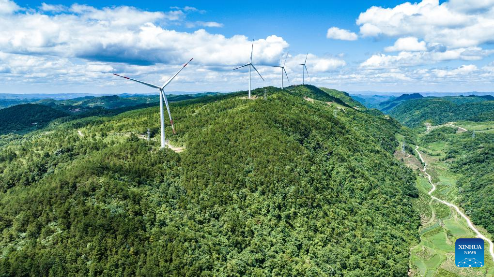 An aerial drone photo taken on July 4, 2025 shows wind turbines in Longli County, southwest China's Guizhou Province. In recent years, Guizhou has made significant progress in ecological construction, striving to transform ecological advantages into developmental strengths.
