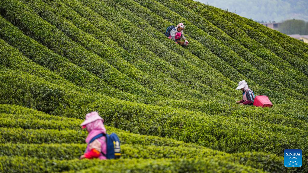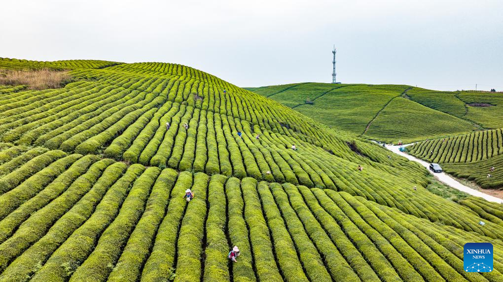 This drone photo taken on April 4, 2025 shows farmers picking tea leaves at a farm in Xixiu District of Anshun City, southwest China's Guizhou Province. In recent years, Guizhou has made significant progress in ecological construction, striving to transform ecological advantages into developmental strengths.