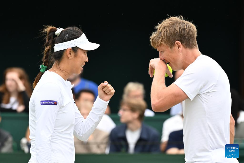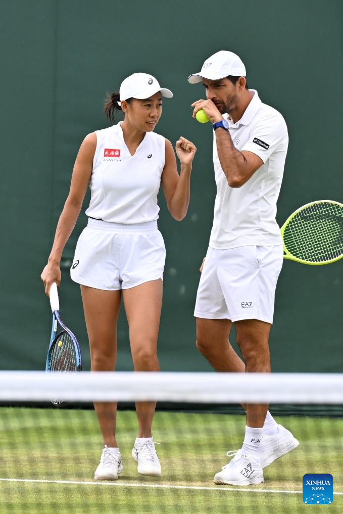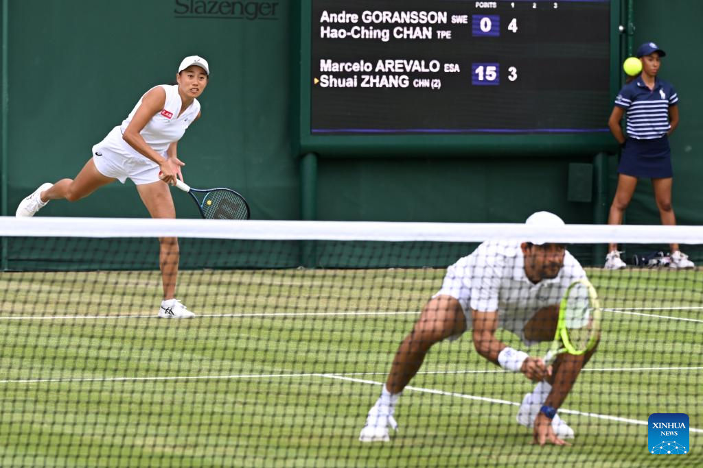 Zhang Shuai (L)/Marcelo Arevalo compete during the mixed doubles first round match between Zhang Shuai of China/Marcelo Arevalo of El Salvador and Chan Hao-Ching of Chinese Taipei/Andre Goransson of Sweden at the Wimbledon Tennis Championships in London, Britain, July 5, 2025. (Xinhua/Zhao Dingzhe)