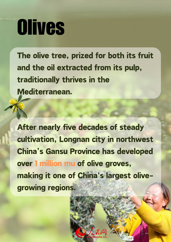 Longnan city in northwest China's Gansu Province features several dry-hot valleys with climate and soil that closely resemble those of the Mediterranean. After nearly five decades of steady cultivation, Longnan has developed over 1 million mu of olive groves, making it one of China's largest olive-growing regions.