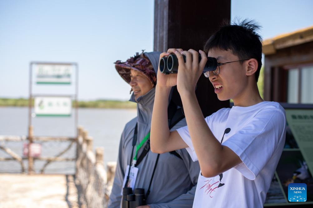 Tourists observe birds at a birdwatching spot at Hangzhou Bay National Wetland Park in Ningbo, east China's Zhejiang Province, July 5, 2025.