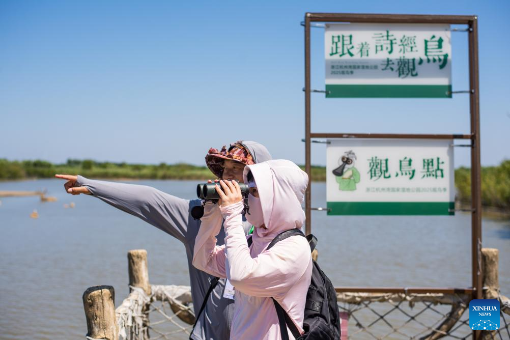 This year's birdwatching season at Hangzhou Bay National Wetland Park, themed "Birds in 'Shi Jing' (a collection of Chinese poems from the 11th to the 6th centuries BC)", features a special birdwatching route. Accompanied by professional volunteer guides, tourists can learn about the wetland's flora and fauna mentioned in "Shi Jing", as well as gain insights into bird species, their behaviors and wetland ecosystems. (Xinhua/Jiang Han)