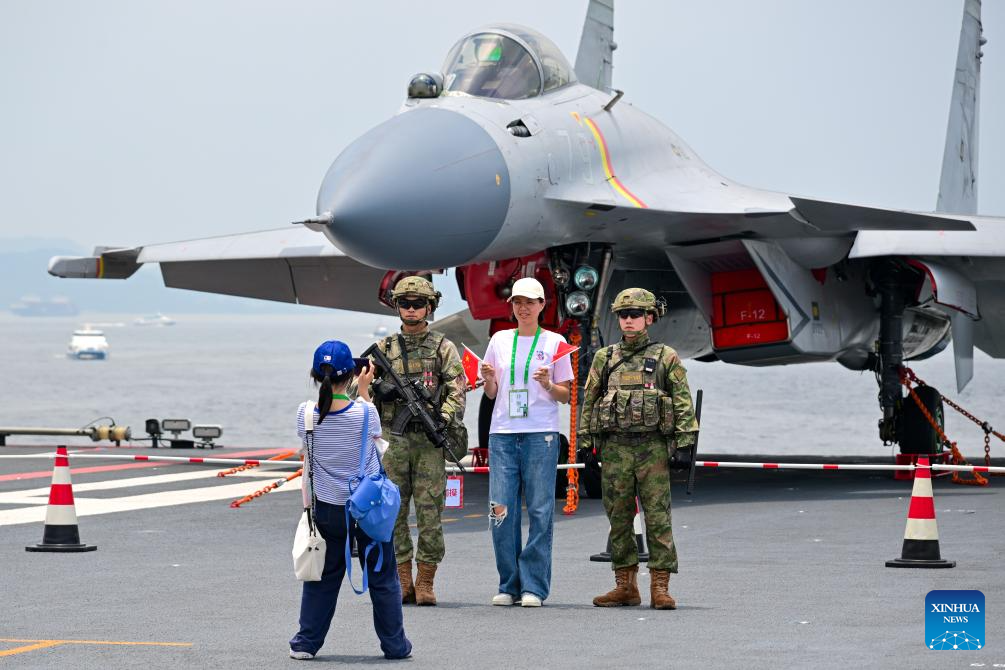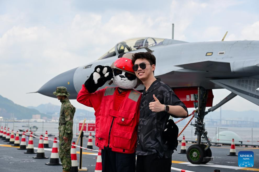 A visitor poses for photos on the aircraft carrier Shandong in Hong Kong, south China, July 5, 2025. Hong Kong celebrated the 28th anniversary of its return to the motherland with a significant visit from a fleet of the Chinese People's Liberation Army Navy, led by China's first homegrown aircraft carrier Shandong.