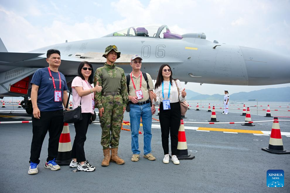 Visitors pose for a photo on the aircraft carrier Shandong in Hong Kong, south China, July 5, 2025. Hong Kong celebrated the 28th anniversary of its return to the motherland with a significant visit from a fleet of the Chinese People's Liberation Army Navy, led by China's first homegrown aircraft carrier Shandong.