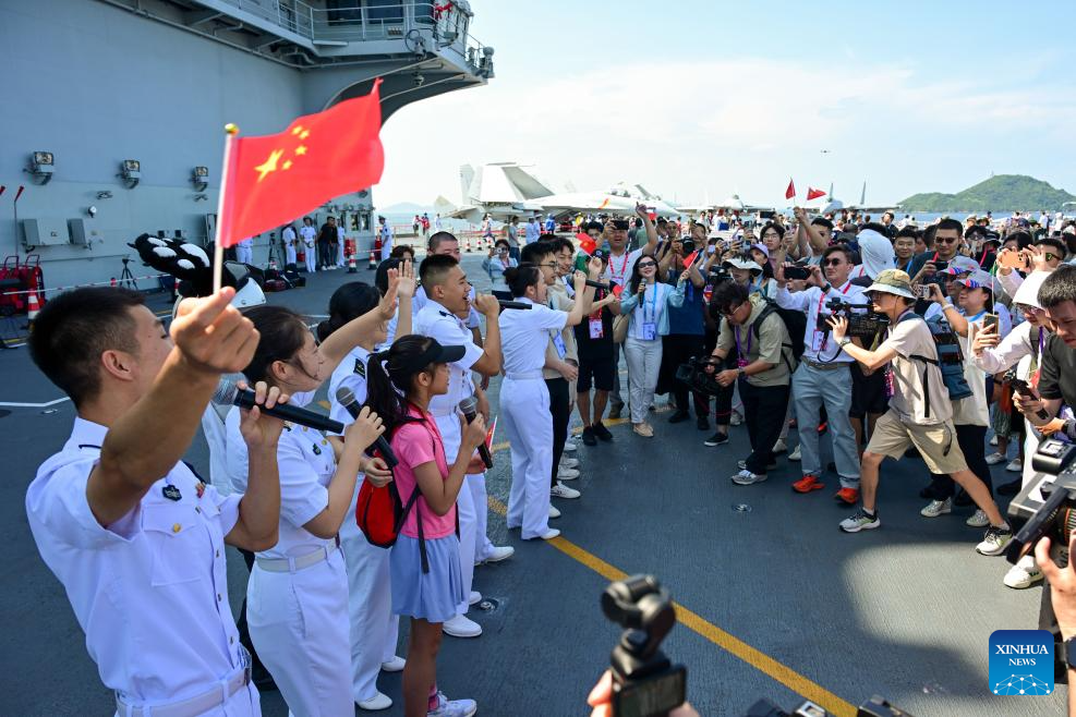 People visit the aircraft carrier Shandong in Hong Kong, south China, July 5, 2025. Hong Kong celebrated the 28th anniversary of its return to the motherland with a significant visit from a fleet of the Chinese People's Liberation Army Navy, led by China's first homegrown aircraft carrier Shandong.
