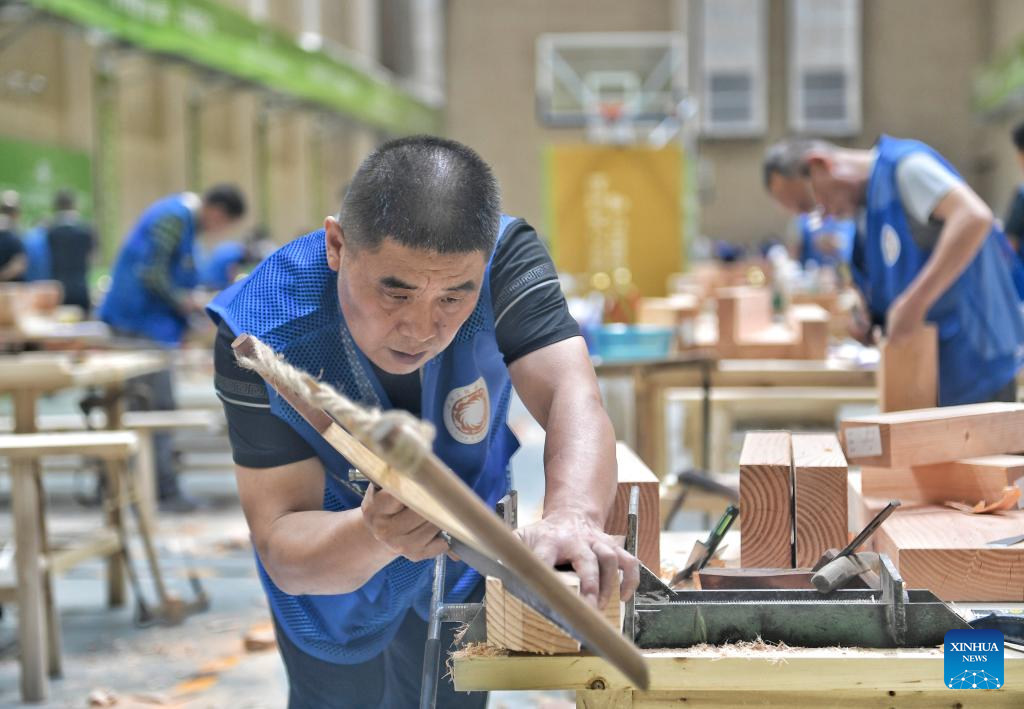 Contestants compete in woodwork relic restoration during the 2nd National Cultural Heritage Vocational Skills Competition in Luzhou City, southwest China's Sichuan Province, July 4, 2025. Starting from July 3, the four-day event attracted nearly 300 contestants competing in six categories. (Xinhua/Liu Kun)
