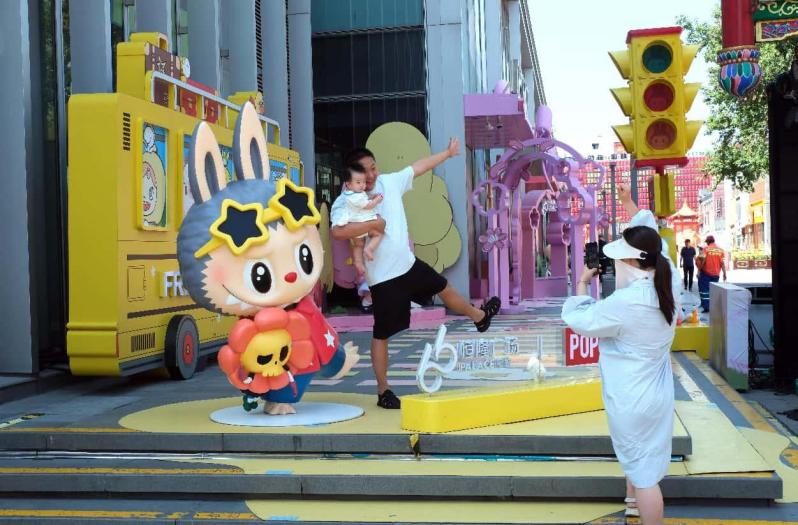 Tourists pose with a Labubu installment in Shenyang, northeast China's Liaoning province. (Photo by Huang Jinkun/People's Daily Online)