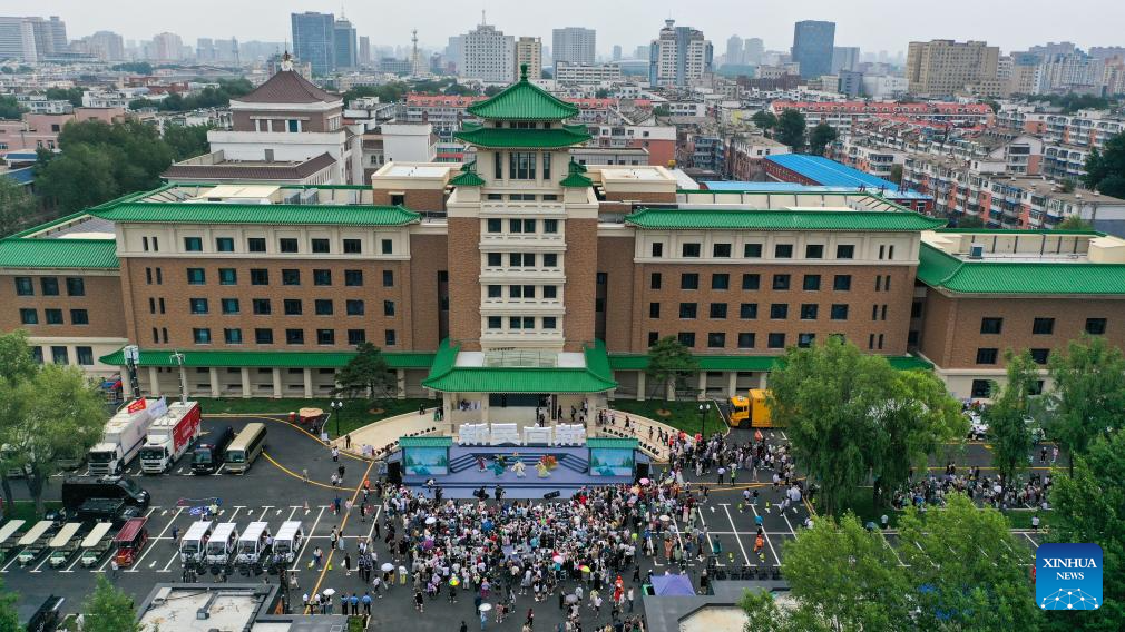 An aerial drone photo taken on July 5, 2025 shows performances in front of Changchun History and Culture Museum in Changchun, northeast China's Jilin Province. Xinmin Street, a historical and cultural street in Changchun of Jilin Province, officially opened to the public on Saturday following renovation.