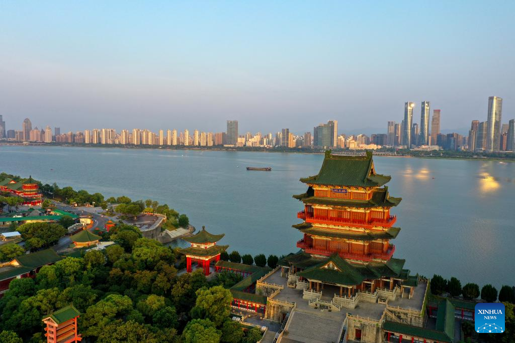 An aerial drone photo taken on July 7, 2025 shows a view of the Tengwang Pavilion scenic area in the morning light in Nanchang City, east China's Jiangxi Province. The Tengwang Pavilion, the 29th iteration in its 1,400-year history, features intricately carved beams and vibrantly painted rafters. It stands majestically along the banks of the Ganjiang River, which winds through eastern China's Jiangxi Province. About 90 percent of the scenic area has been open to the public for free as of Jan. 1 this year when a northward expansion project was fully completed. (Xinhua/Liu Jinhai)