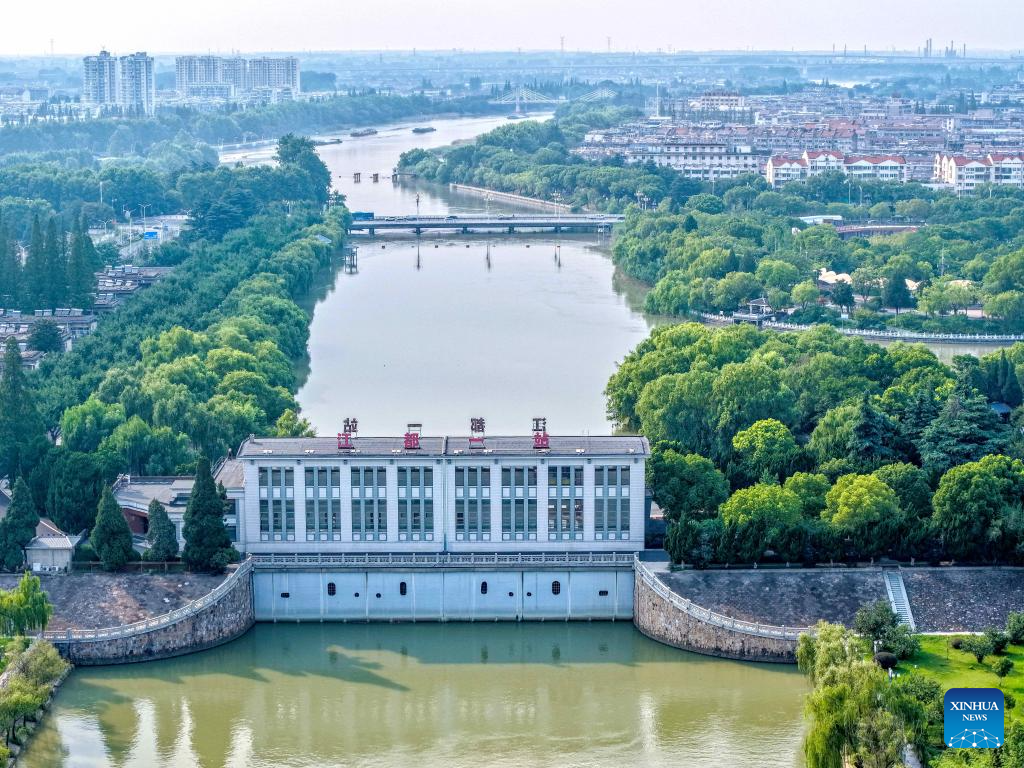 A drone photo taken on July 6, 2025 shows a control station of the Jiangdu water control project on the origin of the eastern route of the South-to-North Water Diversion Project in Yangzhou, east China's Jiangsu Province. The first phase project of the eastern and middle routes of China's South-to-North Water Diversion Project has altogether diverted 80 billion cubic meters of water, a new milestone, with 185 million people directly benefiting from the diversion. (Photo by Ren Fei/Xinhua)