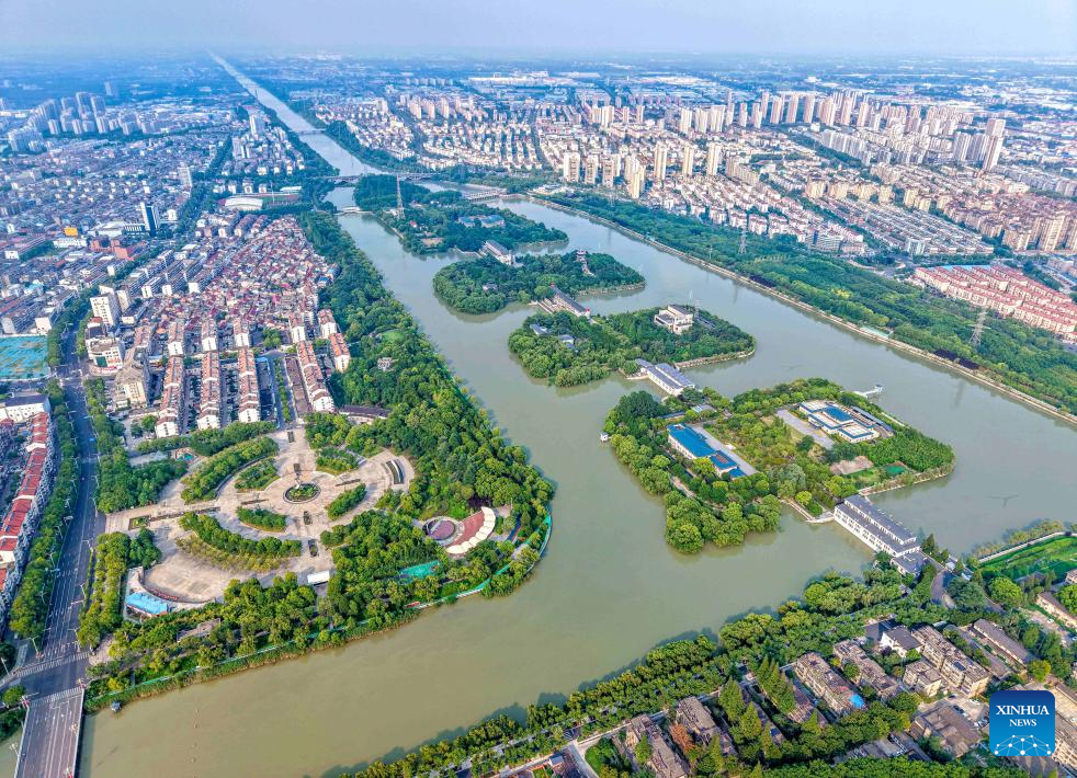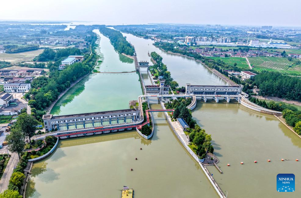 A drone photo taken on July 6, 2025 shows watergates of the first phase project of the eastern route of the South-to-North Water Diversion Project in Yangzhou, east China's Jiangsu Province. The first phase project of the eastern and middle routes of China's South-to-North Water Diversion Project has altogether diverted 80 billion cubic meters of water, a new milestone, with 185 million people directly benefiting from the diversion. (Photo by Ren Fei/Xinhua)
