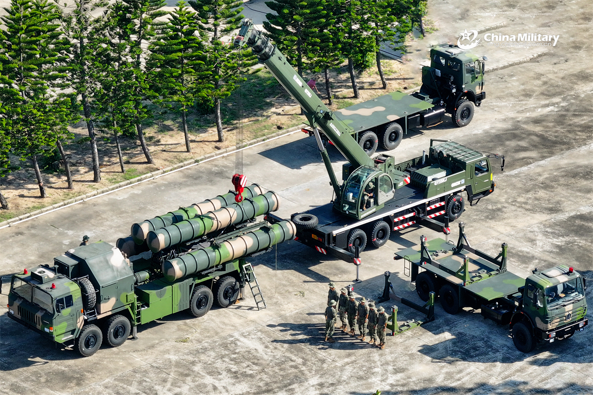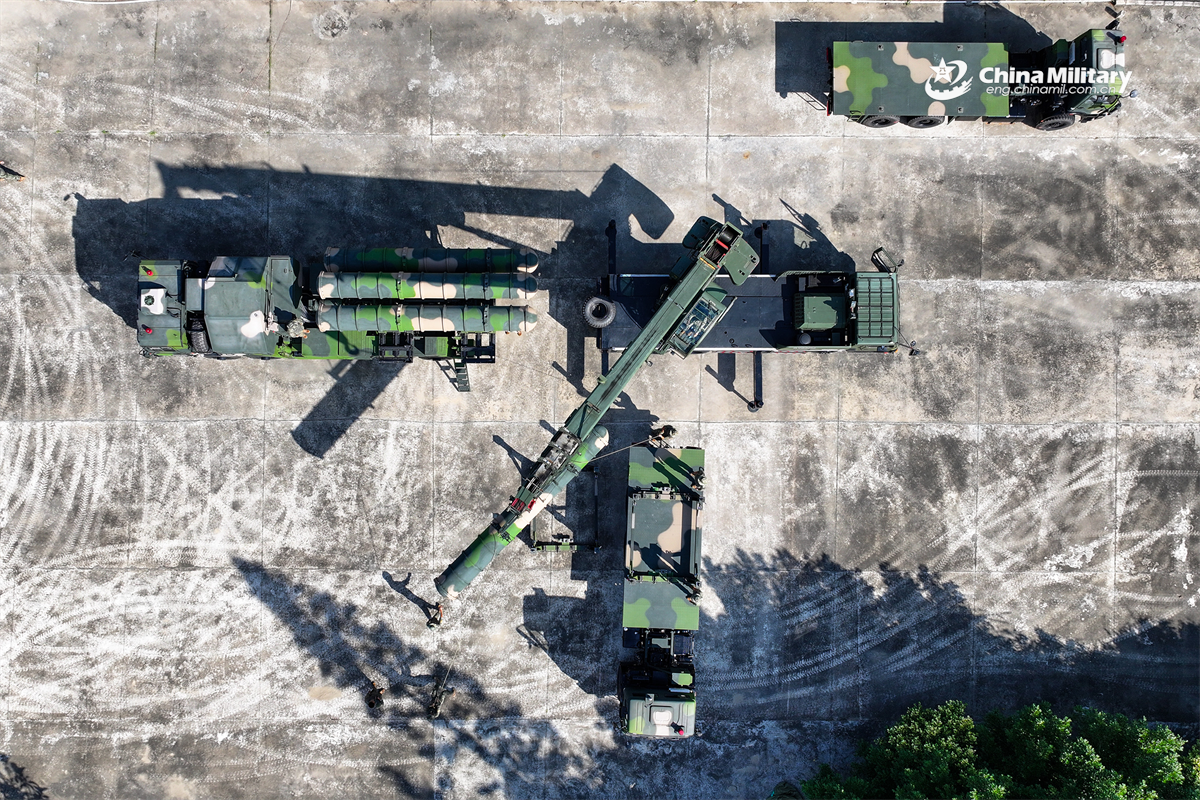 Soldiers assigned to a surface-to-air missile unit with the air force under the Chinese PLA Eastern Theater Command hoist and load surface-to-air missile onto a missile launching truck during a comprehensive training exercise in late June, 2025. (eng.chinamil.com.cn/Photo by Liang Hongwei)
