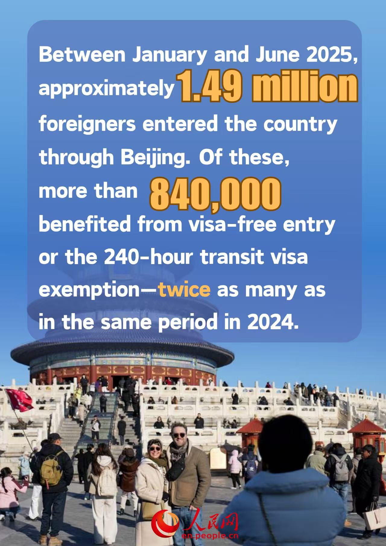 The surge comes as China continues to roll out policies to facilitate inbound travel for foreigners to China. Between January and June, approximately 1.49 million foreigners entered the country through Beijing. Of these, more than 840,000 benefited from visa-free entry or the 240-hour transit visa exemption—twice as many as in the same period in 2024.