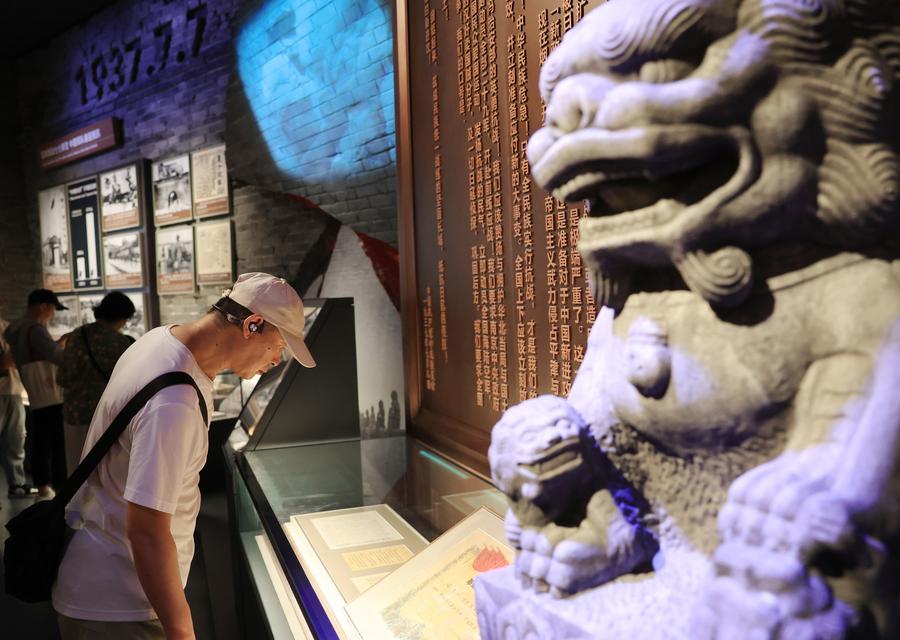 People visit an exhibition themed "For National Liberation and World Peace" at the Museum of the War of Chinese People's Resistance Against Japanese Aggression in Beijing, capital of China, July 8, 2025. (Xinhua/Ju Huanzong)