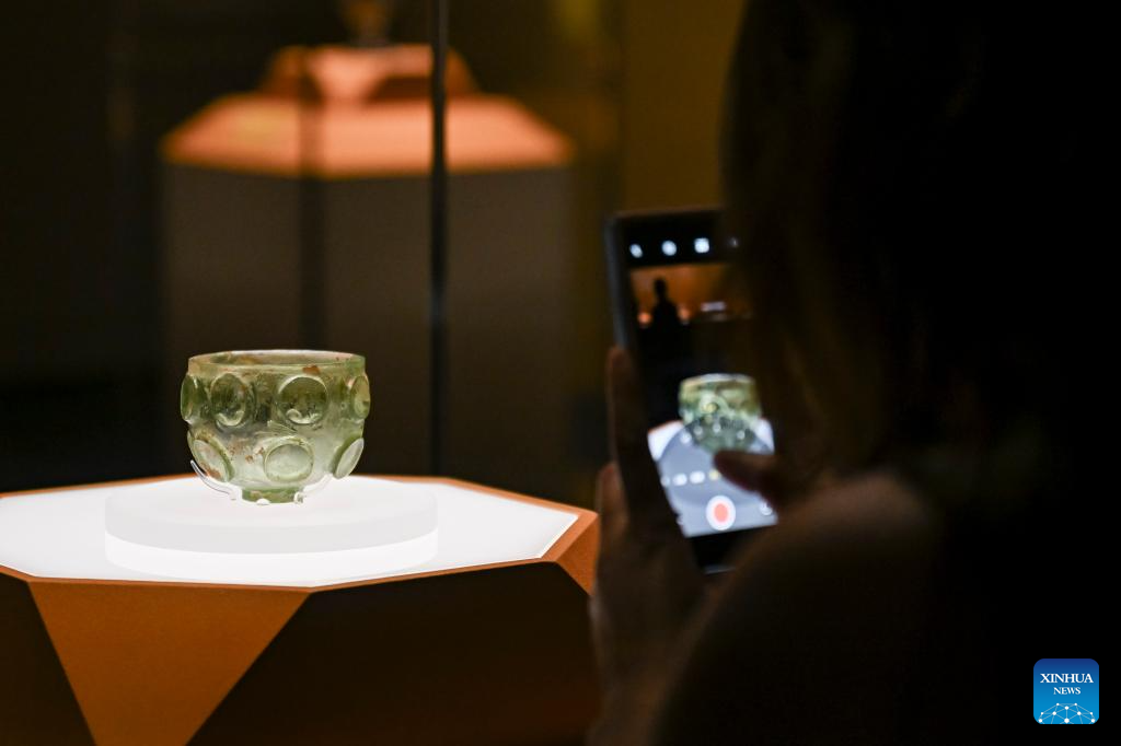 A media worker takes photos of a glass bowl on display during a cultural relic exhibition at the Shanghai Museum East in east China's Shanghai, July 8, 2025. The exhibition, featuring over 300 cultural relics from Guyuan City of northwest China's Ningxia Hui Autonomous Region, opened in Shanghai on Tuesday. (Xinhua/Chen Haoming)